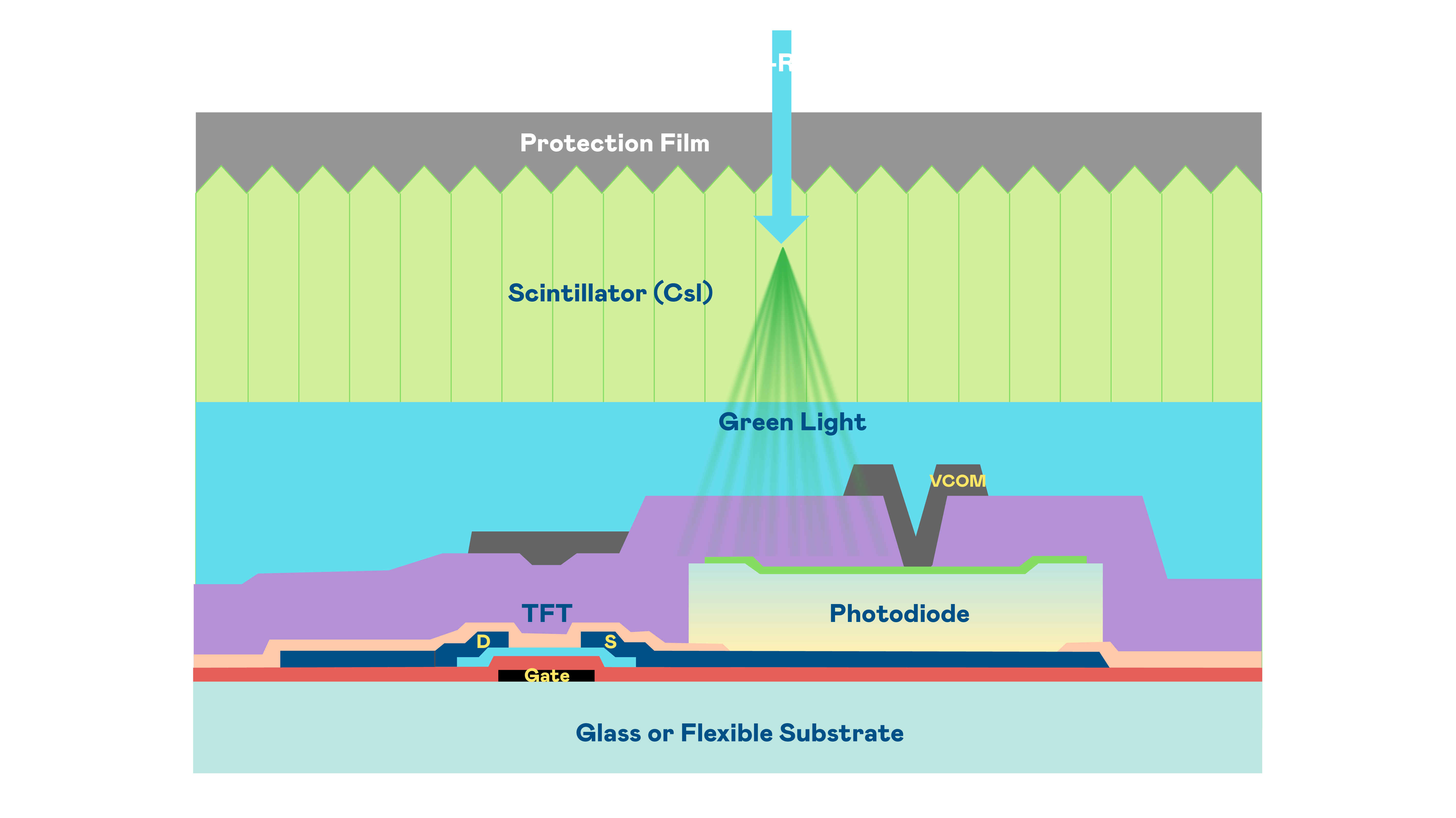 918博天堂的X光影像感測陣列使用薄膜電晶體 (TFT) 作為每個像素的讀取開關,搭配光電二極體(Photodiode)的光電轉換元件,用以感測X光影像訊號。
